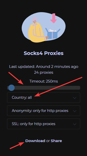 Żeby używać funkcji proxy potrzebujemy liste proxy, którą możemy uzyskać z stron które oferują darmowe proxy lub zakupić prywatną liste.