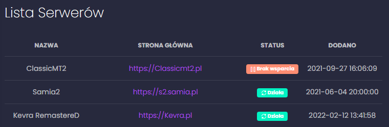 Lista obsługiwanych serwerów